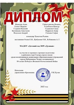 Опубликовано: 23.04.2025Отряд нашего детского сада принял участие в городском Смотре строя и песни, среди команд воспитанников детских садов города Набережные Челны, посвященного 80-летию Победы в Великой Отчественной Войне. Детей и наставников наградили дипломом за хорошую строевую подготовку в районном туре. Поздравляем и желаем дальнейших побед!