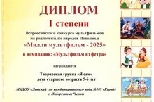 Поздравляем с призовым I местом во всероссийском конкурсе мультфильмов "Милли мультфильм - 2025" творческую группу "Я сам" в составе воспитанников группы № 4, педагогов, музыкального руководителя ДОУ №109 "Курай". В конкурсе приняли участие 121 образовательных организаций.