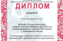 Весной в нашем городе прошел конкурс «Кабинет педагога-психолога образовательной организации». Педагог-психолог нашего ДОУ Дубкова Татьяна Ивановна, как победитель представляла наш город на республиканском конкурсе. И вот, совсем недавно были объявлены лауреаты республиканского конкурса. Наш детский сад – среди лидеров.