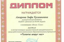 Ежегодный конкурс талантов среди работников учреждений образования каждый год открывает новые имена. Нашему саду очень повезло, ведь музыкальный руководитель Зифа Хусаиновна Амирова, не только талантливый педагог и прекрасный вокалист, она ещё и автор замечательных песен. Авторская песня «Балама» была удостоена диплома лауреата.