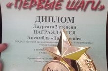 Ансамбль "Настроение" завоевал диплом лауреата второй степени на Республиканском фестиваль-конкурсе юных исполнителей "Первые шаги". Поздравляем наших победителей, желаем дальнейших успехов. Благодарим родителей нашего сада за поддержку!
