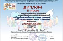 Наша воспитанница средней группы №15 Загирова Сылу победила в Муниципальном конкурсе видеороликов для детей дошкольного возраста и их родителей «НАРОДНЫМ ТРАДИЦИЯМ - ЖИТЬ И КРЕПНУТЬ- ХАЛКЫМ ЙОЛАЛАРЫ – ЯШӘСЕН ҺӘМ НЫГЫСЫН».Цель Конкурса - сплочение семьи через раскрытие и развитие ее творческого потенциала, повышение роли семьи в жизни ребенка, восстановление и укрепление межпоколенных связей, сохранение семейных традиций.Сылу заняла почетное 2 место в номинации «Традиции моей семьи». ПОЗДРАВЛЯЕМ С ПОБЕДОЙ!!!Благодарим родителей и воспитателей - Мавлееву Гульнару Флюровну, Сулейманову Ильсеяр Азатовна за подготовку. -
