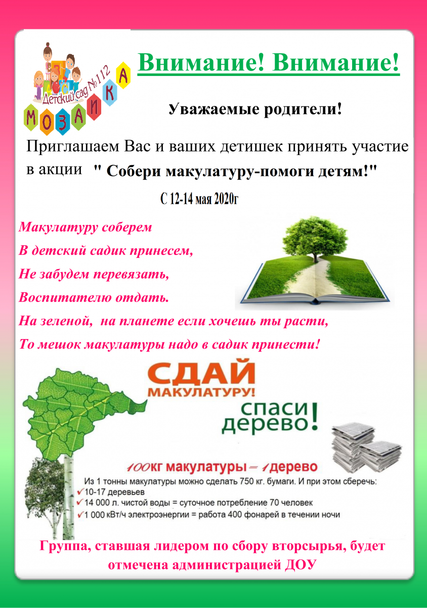 Опубликовано: 30.04.2020С 12 по 14 мая в детском саду пройдет акция по сбору макулатуры. Просим принять активное участие всех желающих.