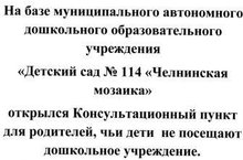 УВАЖАЕМЫЕ РОДИТЕЛИ! На базе МАДОУ «Детский сад № 114 «Челнинская мозаика» открылся Консультационный пункт для родителей, чьи дети не посещают дошкольное учреждение. 08.12.2017