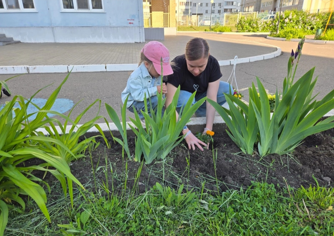 Воспитанники группы 13 вместе с мамами и воспитателем посадили цветы на клумбы.