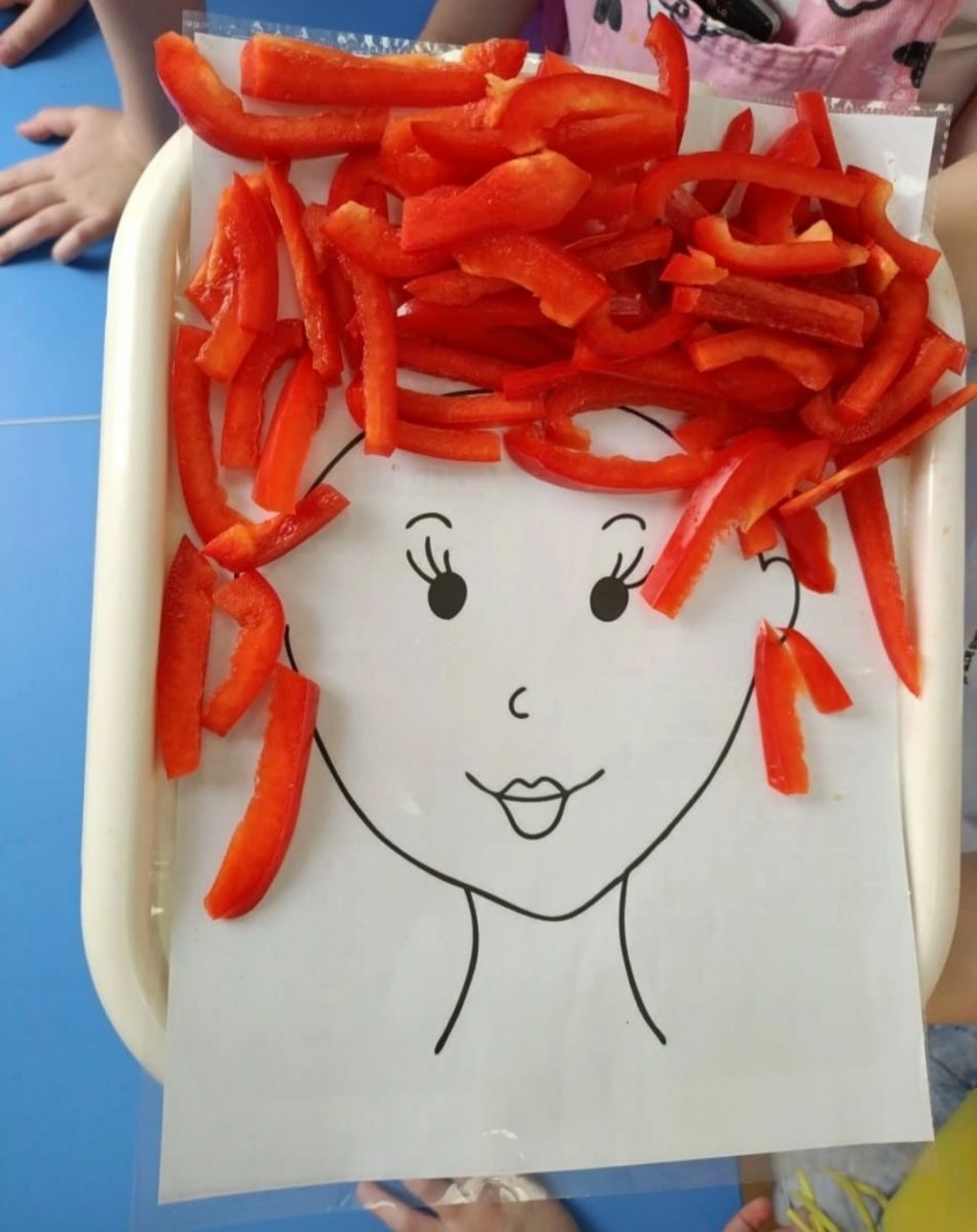Воспитанники группы 9 сегодня делали прически из овощей, потом с аппетитом все съели во время обеда.