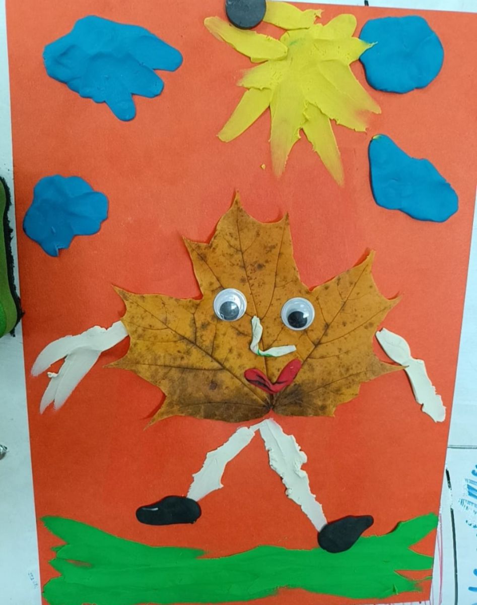 Сегодня воспитанники группы 9 сделали аппликацию из осенних листьев «Осенние чудики», используя пластилин и готовые глазки для человечков, дети назвали их чудиками. -