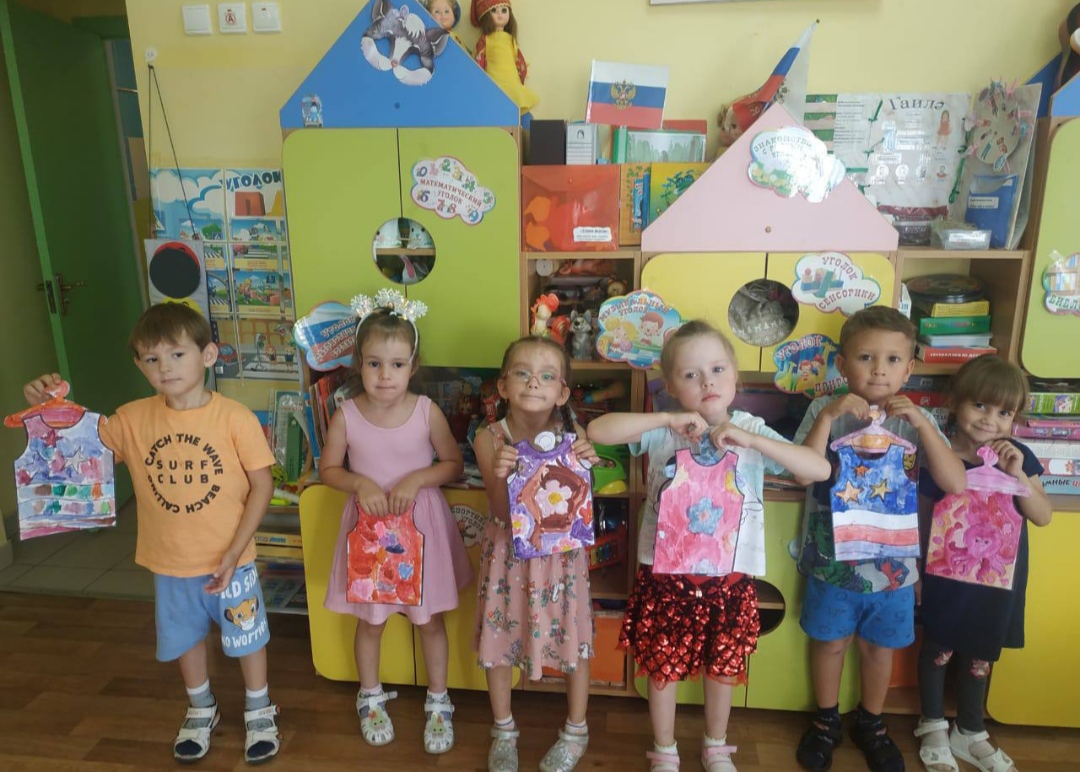 «Летние маечки на вешалке в день творческих дел»-вот такие замечательные маечки разрисовывали воспитанники группы 9 под руководством воспитателя Анастасии Дмитриевны.