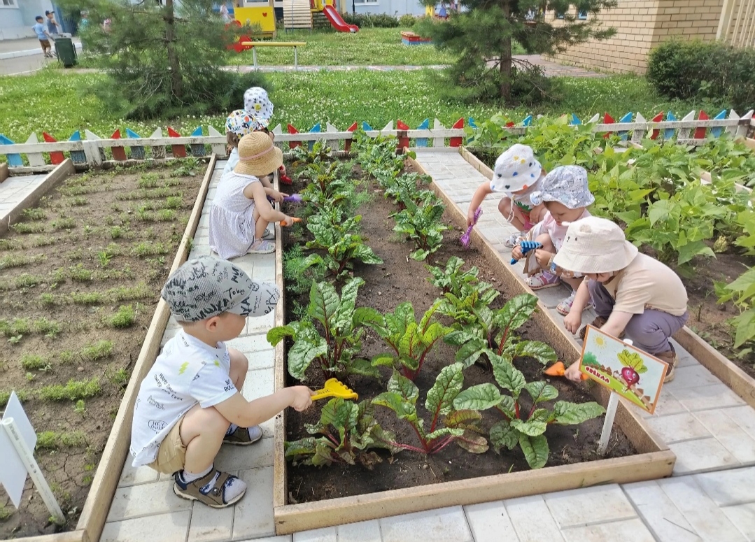 На огороде детского сада дети, совместно с воспитателем, посадили укроп, салат, морковь, свеклу, лук, помидоры, горох и ухаживают за ними. В процессе наблюдений и посильного труда они узнают, что их рост и развитие зависят не только от солнечного света, тепла, влаги, почвы, но и от ухода. Педагоги учат детей поливу, рыхлению, прополке, объясняют, что они рыхлят для того, чтобы к корням растений лучше поступал воздух, учат отличать культурные растения от сорняков.