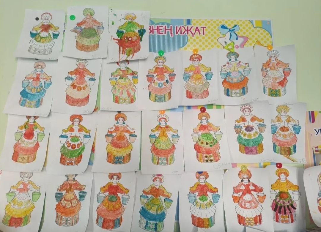 После рассказа детей ждал творческий этап: вдохновлённые яркими образами народной живописи, ребята начали рисовать яркие картины. Кто-то выбрал красочную улыбающуюся матрешку с узорами, кто-то — коня-качалку с золотыми гривой и хвостом, а некоторые попытались изобразить румяную девицу-девушку в традиционном сарафане и кокошнике.