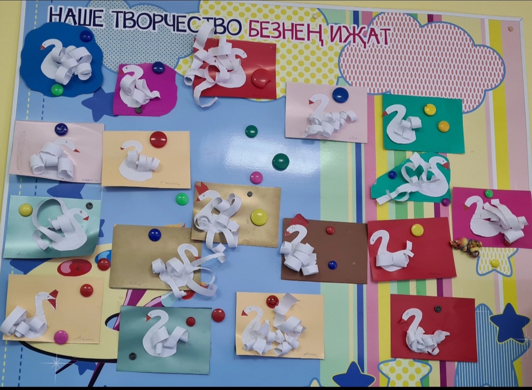 Воспитанники группы 12 при помощи техники объёмной аппликации из полосок бумаги создали таких красивых и пушистых лебедей. Когла соединили все работы вместе, получилось настоящее большое лебединое озеро.