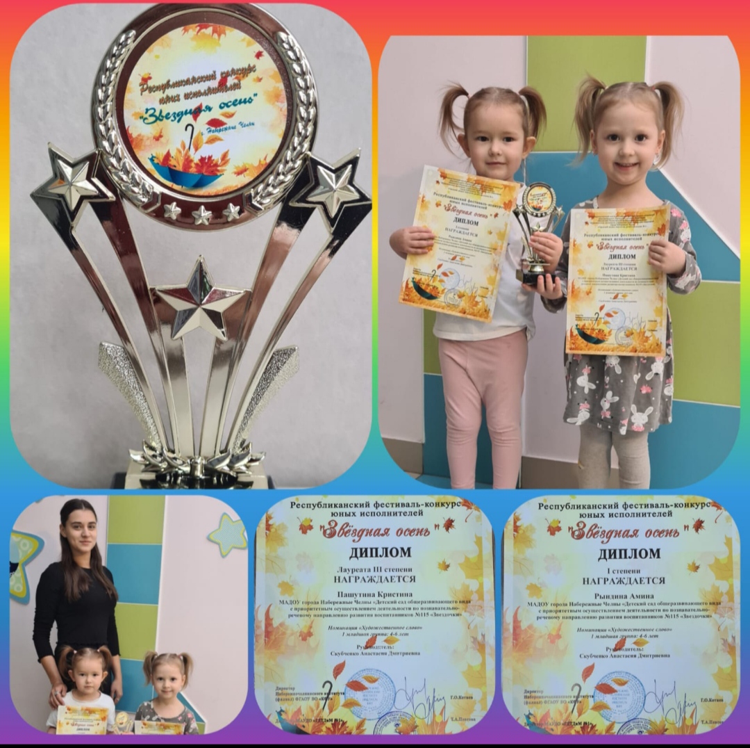 В республиканском фестиваль-конкурсе юных исполнителей "Звездная осень" в номинации Художественное слово (очное выступление) воспитанники группы 9 Рындина Амина и Пашутина Кристина заняли призовые места. Молодцы наши маленькие звездочки! Так держать!