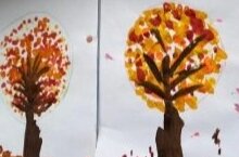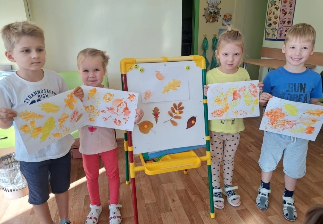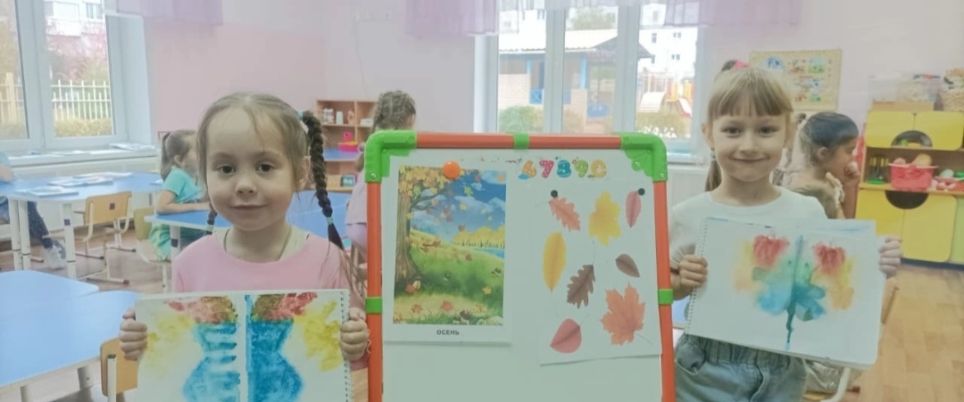 Техника монотипия применяется на занятиях во всех возрастных группах детского сада. При помощи отпечатывания создаются как простые картинки, так и живописные пейзажи. Воспитанники группы 7 под руководством воспитателя Тамары Юрьевна использовали этот приём при рисовании вазы с осенними листьям????????????