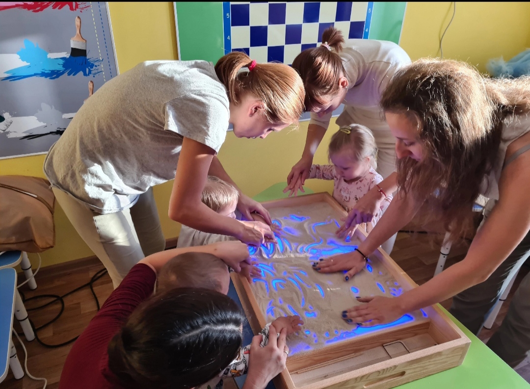 Сегодня специалистами были проведены занятия для родителей и детей:йога для детей,театральная и творческая деятельность, песочная терапия.