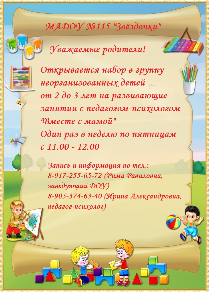 Опубликовано: 04.09.2020Уважаемые родители! Открывается набор в группу неорганизованных детей от 2 до 3 лет на развивающие занятия с педагогом-психологом "Вместе с мамой". Один раз в неделю по пятницам с 11.00 - 12.00