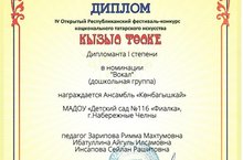 Ансамбль "Конбагышкай" награждён дипломом I степени IV Открытом Республиканском фестиваль-конкурсе национального татарского искусства "Кызыл толке" в номинации "Вокал". От всей души поздравляем наших фиалочек с достойной победой, педагогов за подготовку детей к конкурсу Зарипову Р.М.,