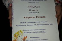 Сегодня 16 февраля подвели итоги городского конкурса "Национальные куклы". Наша воспитанница награждена дипломом 2 степени в номинации "Куклы в национальном костюме" и вручен сертификат участника за национальную куклу "Ак калфак". Подготовка к данному конкурсу осуществлялась под руководством педагогов Инсаповой Сейлан Рашитовны и Шарафутдиновой Эльзы Насгатовны.
