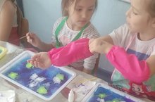 В детском саду проводится кружок "Эбру- танец красок". Дети рисуют на воде, используя древневосточную технику и переносят рисунок на бумагу