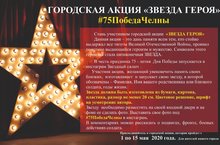 Стань участником городской акции #75ПобедаЧелны.Данная акция – это дань памяти всем тем, кто стойко выдержал все тяготы Великой Отечественной Войны, проявил поистине выдающийсягероизм и мужество. Символом этого героизма стала пятиконечная ЗВЕЗДА.Это и маршальская звезда, и звездочка на пилотке рядового, это ордена Красной Звезды, Славы и Победы, это Золотая звезда Героев СоветскогоСоюза. За каждой звездой – судьба солдата. -