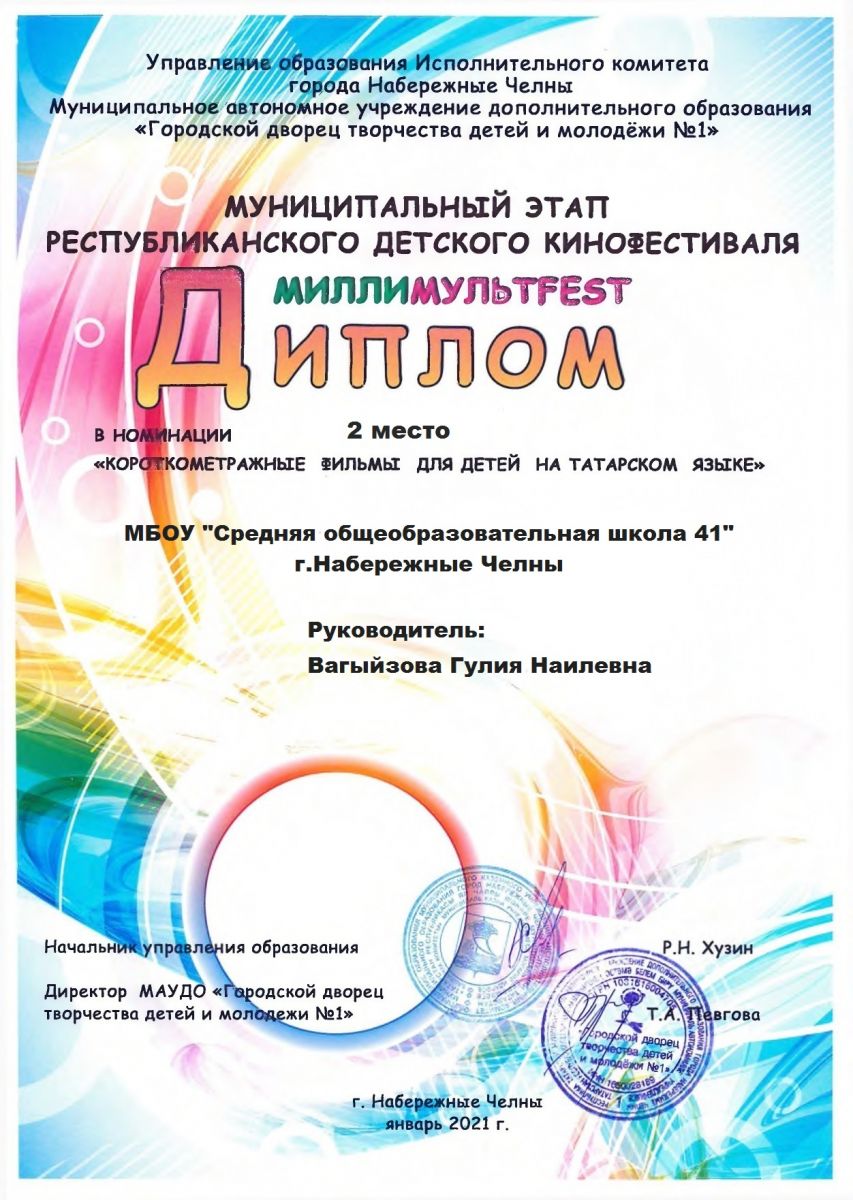 Гатиятуллина Зиля, ученица 6Б класса, в номинации «Короткометражные фильмы для детей на татарском языке» заняла 2 место и прошла на зональный этап. Руководитель: Вагизова Г.Н.