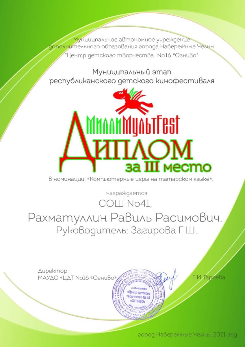 Рахматуллин Равиль Расимович, ученик 5Акласса, в номинации "Компьютерные игры на татарском языке" занял 3 место. Руководитель: Загирова Г.Ш.