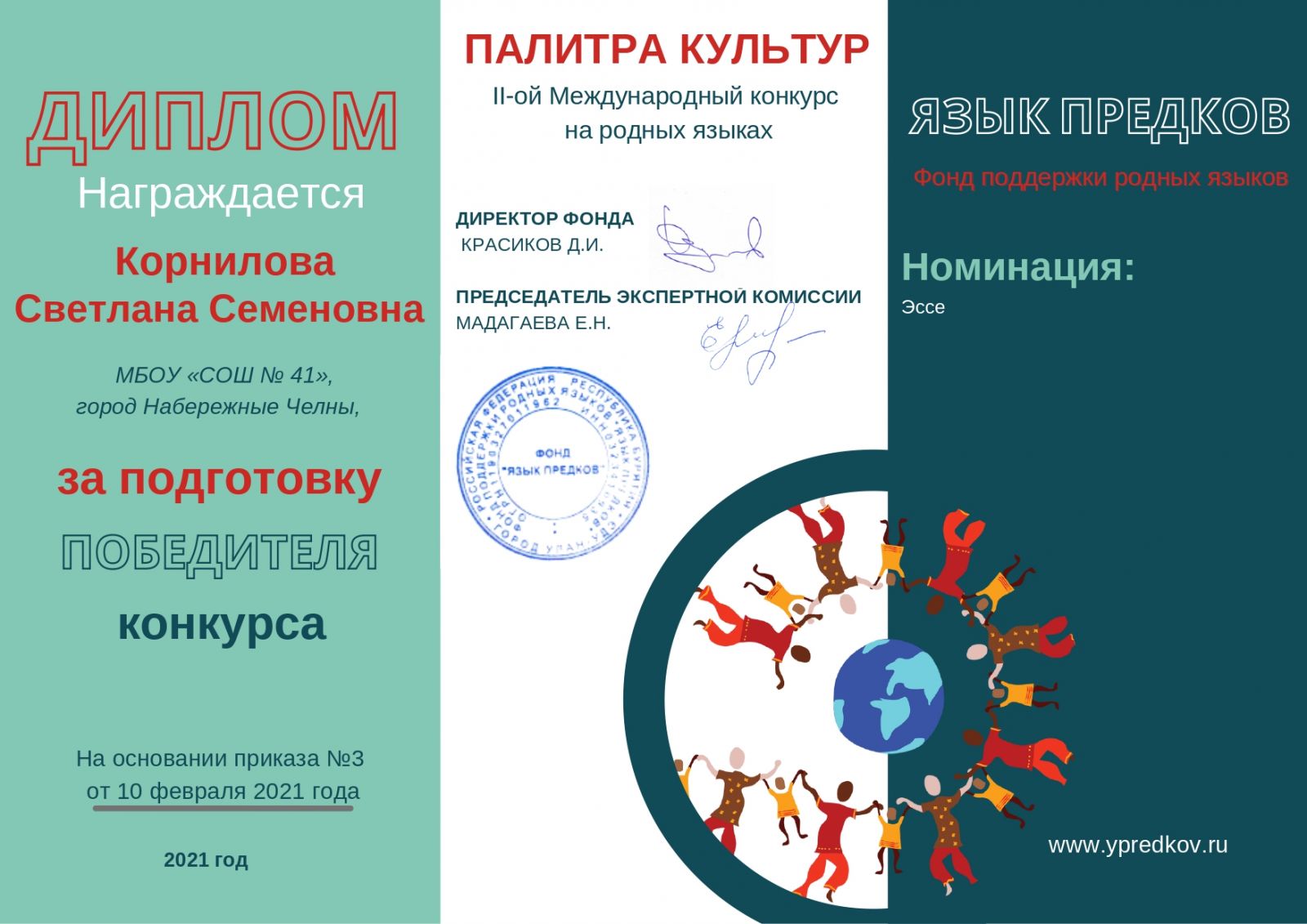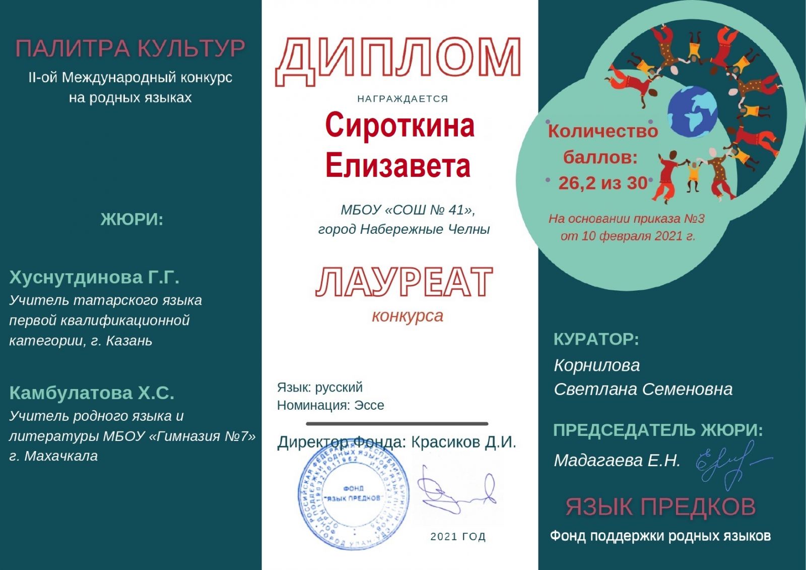 С октября 2020г. по февраль 2021г. Фонд поддержки родных языков «Язык предков» провел конкурс многожанровой культуры народов России «Палитра культур». Победителями конкурса в номинации «Эссе» стали учащиеся нашей школы Шакирова Карина (6 М класс) и Сироткина Елизавета (6 Е класс). Руководитель: учитель русского языка и литературы Корнилова С.С.