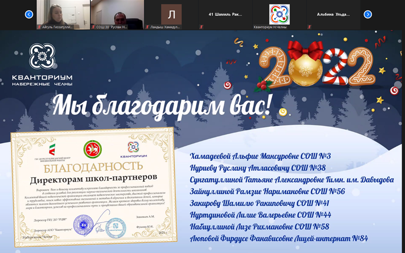 21.12.21 на zoom-встрече с детским технопарком "Кванториум" были подведены итоги уходящего года. Сложилась очень добрая традиция - в преддверии Нового года организовывать такие встречи, где отмечают лучшие ОО, говорят слова благодарности и намечают планы на будущий год