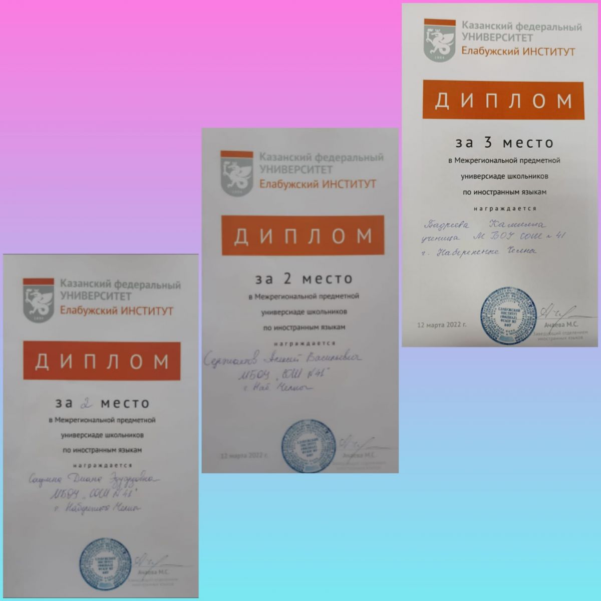 12 марта 2022 году Елабужский институт КФУ провёл Региональную Универсиаду по английскому языку. Наши ученики приняли активное участие в олимпиаде. Сафина Диана, ученица 9Г класса награждена Дипломом II степени (учитель: Латыпова Г.Р.), Сержантов Алексей, ученик 9 Г класса- Диплом II степени (учитель: Салимгараева А.Р.) и Бадреева Камилла, ученица 10 Б класса- Диплом III степени (учитель: Матросова С.Ф.) Поздравляем!