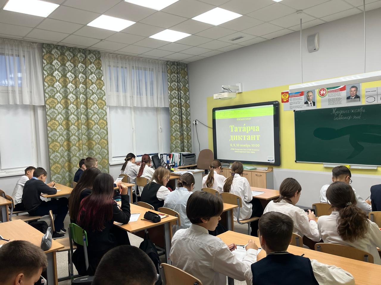 В рамках реализации государственной программы Республики Татарстан “Сохранение национальной самобытности татарского народа” 8 ноября наша школа активно приняла участие во всемирной акции “Татарский диктант". Акция направлена на повышение интереса к грамотному письму, знанию литературного татарского языка, самопроверку орфографических и грамматических ошибок.