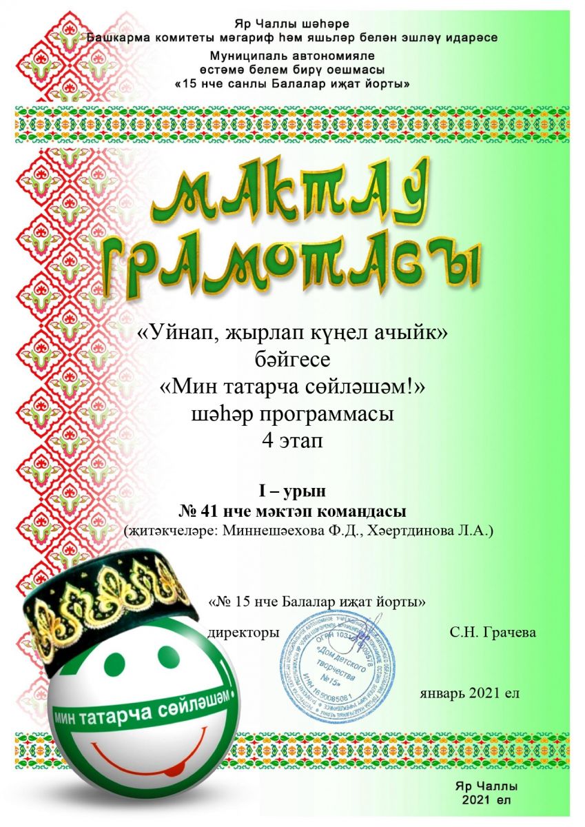. Дипломом II степени награждены Ахметзянова Лейла, 3 О класс (руководитель: Сафина Г.Р.), Набиуллина Алика, 6 Л класс (руководитель: Пилипенко Н.В.), Гусманова Назиля, 6 Е класс (руководитель: Корнилова С.С.), Кадиров Данис, 7 Б класс (руководитель: Латыпова Г.Р.) Поздравляем и так держать!