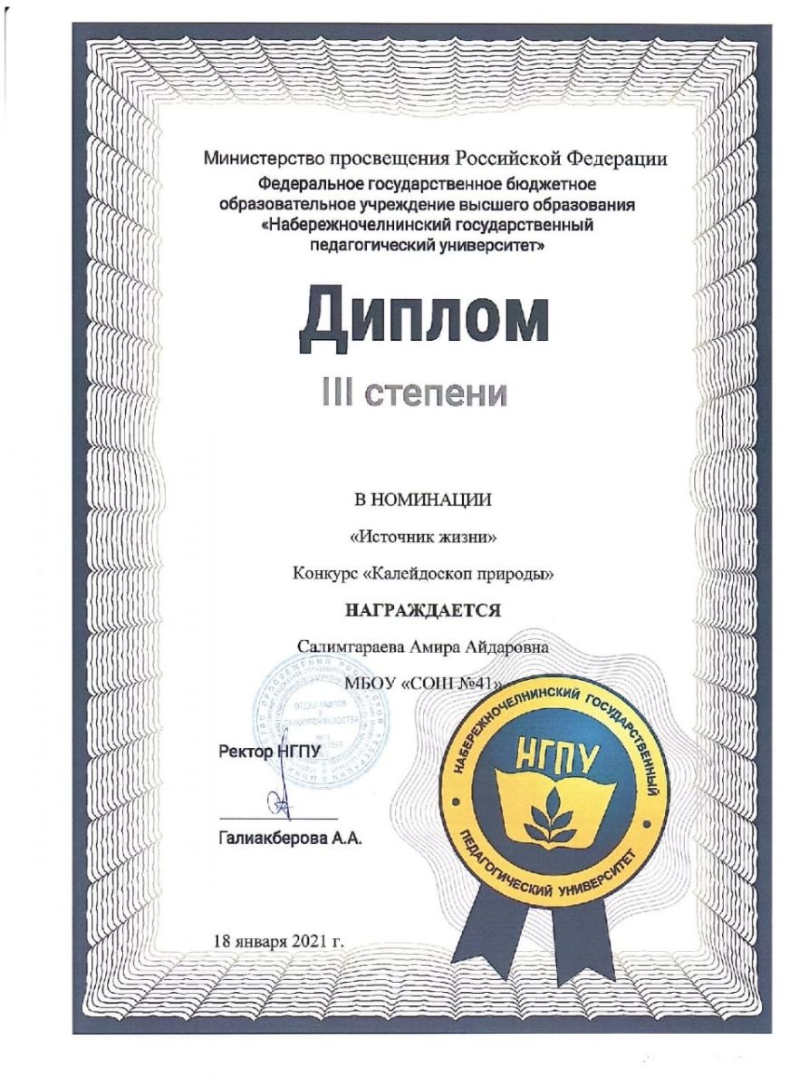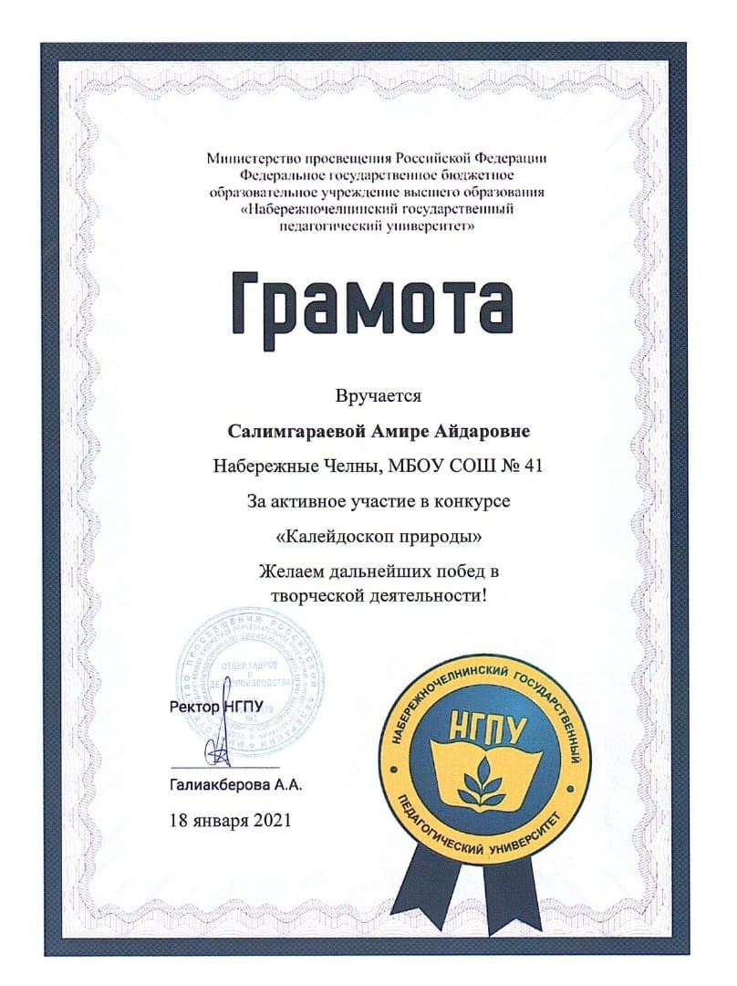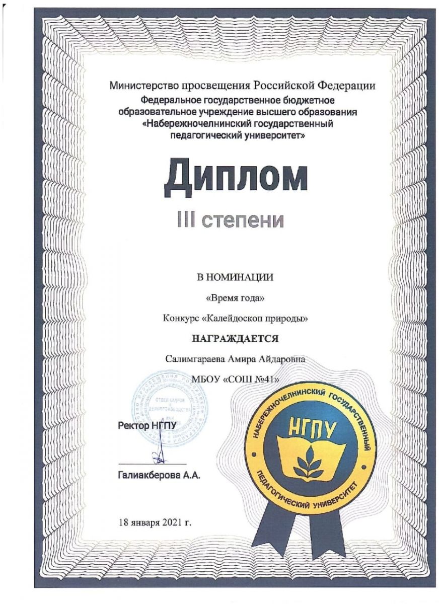 Историко- географический факультет НГПУ проводил конкурс фотографий "Калейдоскоп природы". Всего в нём участвовали 94 человека в разных номинациях. Ученица 8 Г класса Салимгараева Амира Айдаровна приняла участие в двух номинациях и по итогам голосования стала ПРИЗЕРОМ в номинациях "Источник жизни" и "Время года ". Поздравляем и желаем дальнейших успехов!