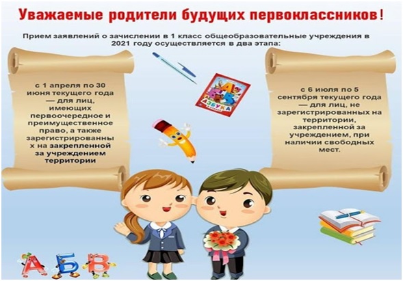 - для детей, проживающих на закрепленной за школой территории, а так же для имеющих преимущественное право зачисления в первый класс - с 1 апреля по 30 июня 2021 года;