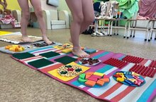С целью укрепления детского здоровья педагоги в нашем детском саду активно используют массажные коврики «Дорожки здоровья». Польза их для детского организма очень существенна - это и оздоровительный массаж ступней, и профилактика плоскостопия. «Дорожка здоровья» способствует правильному формированию стопы и формирует правильную осанку; улучшает иммунитет и активизирует защитные силы организма; тонизирует весь организм и стимулирует развитие малыша, в том числе и речевое; снимает нервное напряжение, усталость и расслабляет; улучшает кровообращение и стимулирует рефлекторные зоны. В качестве наполняющих предметов на наших дорожках можно рассмотреть самые разные материалы, используемые в обиходе. Это деревянные палочки, камушки, верёвки, пуговицы, ракушки и даже губки для мытья посуды. Дети идут по ним в свои кроватки, а также возвращаются после пробуждающей гимнастики по окончании дневного сна. Таким образом происходит сохранение и укрепление здоровья детей, тем самым формируется привычка к здоровому образу жизни. Ребята 10 группы с воспитателем Сергеевой Натальей Сергеевной регулярно занимаются ходьбой по массажным дорожкам.