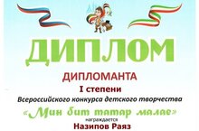 18 апреля 2024 г. состоялся II заключительный тур Всероссийского конкурса детского творчества «Мин бит татар малае!». Организаторами конкурса являлись МКУ «Управление образования» ЕМР РТ и МБДОУ «Детский сад комбинированного вида №29 «Золотая рыбка» Елабужского муниципального района при методической поддержке кафедры теории и методики дошкольного и начального образования Елабужского института Казанского федерального университета. Основные задачи конкурса: 1. Содействовать развитию творческих способностей, эстетических чувств, удовлетворению потребности в самовыражении детей дошкольного возраста на татарском языке. 2. Совершенствовать художественно-речевые исполнительские навыки дошкольников. 3. Приобщать участников образовательного процесса к духовным традициям и историко-культурному наследию татарского народа и народов, проживающих в Российской Федерации. 4. Способствовать формированию гражданско-патриотических чувств – любовь, уважение к Родине, уважение к языкам, традициям народов, проживающих в Российской Федерации. В конкурсе принимали участие воспитанники дошкольных образовательных учреждений 4-7 лет, демонстрируя способности в различных жанрах искусства: поэтическом, вокальном, танцевальном, художественном и т.д. Конкурсная программа исполнялась на татарском языке. Среди участников конкурса и наш воспитанник - Назипов Раяз. Раяз покорил членов жюри конкурса и стал обладателем диплома I степени. Гордимся успехами Раяза! Поздравляем Раяза и его творческого наставника - педагога Сабирову Диляру Зявдатовну - с победой и желаем покорения новых вершин!