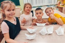 Квадратный листочек бумаги, ловкие движения пальцев – и вот уже в руках появляется зайчонок, щенок, кораблик или самолётик. Мир оригами необычайно широк и разнообразен. Сейчас им увлекаются и взрослые, и дети. Секрет популярности оригами очень прост - несложные приёмы работы с бумагой и фантазия позволяют создать увлекательный, ни на что не похожий мир. Оригами, как вид конструирования из бумаги, развивает у детей мышление, память, мелкую моторику, пространственное воображение. На одном из занятий в 3 группе Аким учил ребят делать машину, а Дарья - кораблик. Ребята получили массу положительных впечатлений и огромное удовольствие в процессе превращения обычного листочка бумаги в машины и кораблики.