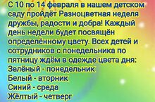 В нашем детском саду по традиции ежегодно проходят разнообразные тематические недели. Одна из таких - «Разноцветная неделя». В этом году она проходит в период с 10 по 14 февраля. «Разноцветная неделя» дает возможность проявить фантазию, индивидуальность и оригинальность каждому ребенку. Детство – время удивительных открытий, и мы решили открыть мир цвета. Пять разноцветных дней – это время психологической разгрузки и снятия эмоционального напряжения, что так необходимо не только детям, но и взрослым. Обязательное условие участия в Разноцветной неделе является соответствие цвета одежды детей и сотрудников детского сада цвету дня: