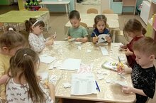 Ребята 9 группы увлеченно выполняют работу с использованием ножниц под руководством воспитателя Фариды Лябибзяновны. -