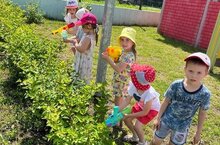 Ребята 7 группы совмещают игру с трудовой деятельностью, занимаясь поливкой кустов с воспитателем Айгуль Занифовной. -