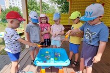 Наши малыши с пользой, активно и весело проводят на прогулке время. Пока одни задорно играют в мяч и с водяными пистолетами, плетут из бисера браслеты и изучают насекомых в траве, другие - дети 12 группы с воспитателем Татьяной Валентиновной - забавно ловят морских обитателей, плавающих в ёмкости, с помощью магнитных удочек. Казалось бы, игра незамысловатая, но при этом она отлично развивает сенсорные навыки, способность концентрировать внимание, моторику и координацию движений, а также усидчивость, меткость и упорство. Игра очень увлекательна и захватывает внимание участников игры надолго. Малыши учатся размышлять, куда направить «крючок», чтобы рыбка точно на него попалась. Таким образом развивается логическое мышление. Магнитная рыбалка учит отличать фигурки по форме, весу, цвету и определять количество присутствующих предметов. Данная игра нравится всем нашим детям без исключения - и мальчикам и девочкам, поэтому магнитная рыбалка стала одним из полюбившихся занятий для весёлого времяпровождения на прогулке.
