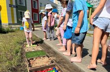 Приоритетными направлениями в деятельности детского сада являются охрана жизни и укрепление здоровья детей, приобщение их к ценностям здорового образа жизни. Особое внимание уделяется здоровьесбережению воспитанников в летний оздоровительный период. Основными средствами оздоровления выступают естественные факторы: солнце, воздух, вода. Для укрепления здоровья детей в летний период в детском саду создана «Тропа здоровья». Это один из современных и очень удобных здоровьесберегающих методов, применяемых сегодня в воспитательном процессе. "Тропа здоровья" представляет из себя дорожку, состоящую из естественных, подручных и природных материалов. Дорожка оборудована таким образом, чтобы детские босые ножки могли пройтись по разным на ощупь поверхностям, которые будут массировать ступни. Как известно, на ступнях человека расположено порядка шестидесяти активных зон, связанных с различными органами. Оказывая на них воздействие разной степени интенсивности, можно повысить иммунитет ребенка, энергетику, снять стресс и улучшить его общее психоэмоциональное состояние. Основными целями организации тропинки здоровья являются: профилактика плоскостопия, улучшение координации движения и функций сердечно-сосудистой и дыхательной систем. Проходя по тропинке, ребёнок начинает лучше понимать возможности своего тела и учится тем самым относиться к нему бережнее. Таким образом, правильно оформленная и оборудованная тропа здоровья помогает увлечь детей игрой в здоровье. Ребята 10 группы регулярно занимаются хождением по Тропе здоровья с воспитателем Натальей Сергеевной.