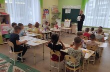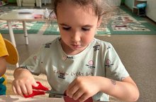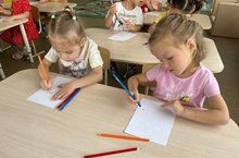 На занятии закрепили цвета - красный, оранжевый, синий - на 3х языках.
