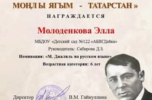 С 13 января по 13 февраля 2023 года МБУ «Централизованная библиотечная система» был проведён V региональный конкурс «Песенный край – Татарстан//Моңлы ягым – Татарстан». Данное мероприятие было приурочено ко дню рождения татарского поэта и писателя Мусы Джалиля. Конкурсанты представили на суд жюри видеозаписи выразительного прочтения произведений М.Джалиля и о М.Джалиле, стихи собственного сочинения, рисунки и поделки, созданные по произведениям М.Джалиля. В данном конкурсе приняла участие наша воспитанница Молоденкова Элла под руководством воспитателя по обучению детей родному языку Сабировой Диляры Зявдатовны. Элла представила своё творческое выступление в номинации "М.Джалиль на русском языке" и заняла II место. Поздравляем нашу воспитанницу и её творческого наставника, гордимся и желаем успехов!