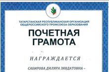 Профсоюзная организация объединяет всех членов коллектива, участвует в повседневной жизни, буднях и праздниках, конкурсах и соревнованиях, бережёт традиции детского сада. Сабирова Диляра Зявдатовна, воспитатель по обучению детей родному языку, – наш инициативный и ответственный профсоюзный лидер. Возглавляемая ею профсоюзная деятельность в детском саду ориентирована на социальное партнерство и диалог, строящиеся на принципах социальной ответственности и реализации социально значимых инициатив. Диляра Зявдатовна – активный участник и инициатор всех общественно-важных мероприятий в нашем трудовом коллективе. За активную и успешную работу в профсоюзной жизни детского сада Диляра Зявдатовна награждена Почётной грамотой Татарстанской Республиканской Организации Общероссийского Профсоюза Образования. Поздравляем нашу коллегу и желаем Диляре Зявдатовне благополучия и новых успехов в столь ответственной работе!