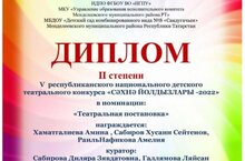 В период с 30 ноября по 29 декабря 2022 года прошёл V республиканский национальный детский театральный конкурс «Сәхнә йолдызлары -2022». Организаторы конкурса: ИДПО ФГБОУ ВО "НГПУ", МКУ «Управление образования Исполнительного комитета Менделеевского муниципального района РТ», МБДОУ «Детский сад комбинированного вида № 8 «Сандугачым» Менделеевского муниципального района РТ». Данный конкурс проводился с целью побуждения интереса к татарской устной речи, развития детского национального театрального фестиваля, методической поддержки организаторов творческой, игровой и досуговой деятельности детей. Перед организаторами конкурса стояли такие задачи, как выявление одарённых детей, обладающих творческим потенциалом; формирование у детей интереса к изучению татарского языка через создание национального культурного пространства; воспитание художественного вкуса и приобщение к театральному искусству юных исполнителей; выявление и поддержка одаренных детей в жанре театрального искусства; приобщение детей к культуре чтения литературных произведений; объединение педагогов для обмена опытом. В данном фестивале-конкурсе принял участие творческий коллектив нашего сада в номинации "Театральная постановка" и стал обладателем диплома II степени. От всей души поздравляем наших юных артистов - Хаматгалиеву Амину, Сабирова Хусаина, Сейтенова Раиля, Нафикову Амелию - и их кураторов - педагогов Сабирову Диляру Зявдатовну и Галлямову Ляйсан Илдусовну. Гордимся и желаем не останавливаться на достигнутом, покоряя новые вершины исполнительского мастерства!