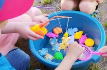 Небо хоть и частенько хмурится, но сквозь просвет пушистых серых облаков пробиваются яркие солнечные лучи, как бы зовя наших ребятишек поиграть. Поэтому наши малыши с пользой, активно и весело проводят на прогулке время. Пока одни задорно играют в мяч, другие забавно ловят морских обитателей, плавающих в ёмкости, с помощью магнитных удочек. Казалось бы, игра незамысловатая, но при этом она отлично развивает сенсорные навыки, способность концентрировать внимание, моторику и координацию движений, а также усидчивость, меткость и упорство. Игра очень увлекательна и захватывает внимание участников игры надолго. Малыши учатся размышлять, куда направить «крючок», чтобы рыбка точно на него попалась. Таким образом развивается логическое мышление. Магнитная рыбалка учит отличать фигурки по форме, весу, цвету и определять количество присутствующих предметов. Данная игра нравится всем нашим детям без исключения - и мальчикам и девочкам, поэтому магнитная рыбалка стала одним из полюбившихся занятий для весёлого времяпровождения на прогулке.