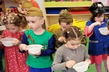 Завтрак съешь сам.. Считается, что слова этого известного изречения принадлежат знаменитому полководцу Суворову Александру Васильевичу. Утренняя трапеза призвана наполнять энергией и заряжать бодростью. А главным "поставщиком" сил, бодрого настроения и крепости духа считается каша. Каша – одно из самых распространенных блюд русской кухни. Она питательна, полезна, сытна и легко усвояема организмом. Не забывали о ней и во время Великой Отечественной войны. Полевая кухня всегда шла впереди войска. Задачей поваров было приехать на место стоянки раньше солдат и ждать их с горячей едой. Одним из главных блюд бойцов Советской армии по время Великой Отечественной войны была именно фронтовая каша из гречки и тушенки. Отсюда и название - солдатская каша. Варили её в большом количестве, в огромных котлах над костром. Историю возникновения солдатской каши опять-таки приписывают великому полководцу Суворову А.В. По легенде, в одном из походов, когда запасы продуктов подходили к концу, Суворов предложил сварить кашу для солдат из всего, что осталось в наличии. В дело пошли не только остатки сала и мяса, но и крупы: горох, перловка, пшено и гречка. Солдаты были накормлены, а это считалось главным залогом успешного сражения. Сегодня мы с ребятами перенеслись в далёкие времена, когда наши деды и прадеды в перерывах между боями устраивали привал, и отведали горячей солдатской каши, с любовью и теплотой приготовленной нашими поварами. Каша получилось ароматной, вкусной, разваристой. И взрослые, и дети получили заряд восторженных эмоций. Спасибо нашим поварам за старание! -