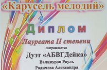 В этот чудесный мартовский день состоялся Городской вокальный конкурс "Карусель мелодий". Конкурс организовала и провела Детская музыкальная школа №2 при поддержке Управления культуры Исполнительного комитета города Набережные Челны. В конкурсе приняло участие огромное количество вокалистов. По итогам обсуждения профессионального жюри наш творческий коллектив дуэта "АБВГДейка" под руководством музыкального руководителя Заляловой Л.Р. отмечен заслуженной наградой - дипломом лауреата II степени. Достойным украшением конкурса стало прекрасное выступление наших талантливых ребят - Валинурова Рауля и Родичевой Александры. Получить диплом лауреата – это большое признание высокого исполнительского уровня коллектива. Мы с большой радостью и гордостью поздравляем наших ребят и их творческого наставника! Желаем новых побед!
