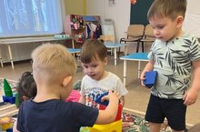 В 1 группе дети под руководством воспитателя Эллины Олеговны играли в игру «Построим башню».