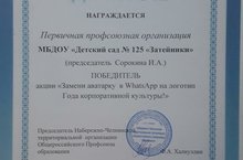 В Год корапативной культуры, объявленной Общероссийским профсоюзом, наш сад поддержал акцию "Замени свою аватарку в WhatsApp на логотип Года корпаративной культуры" и по завершению наш сад стал призёром!!!