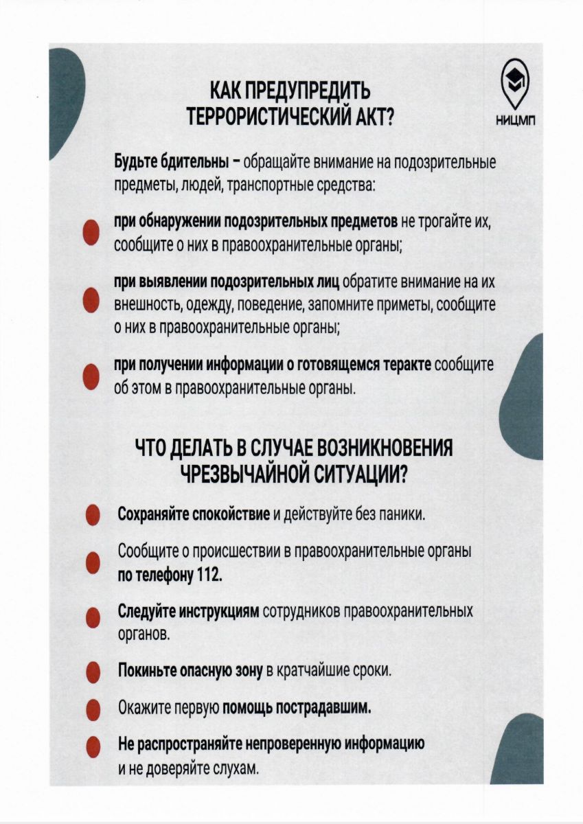 Опубликовано: 27.03.2024Для повышения осведомленности граждан о ключевых правилах безопасного поведения в случаях террористических угроз специалисты НИЦ Мониторинга и профилактики разработали информационные карточки с пошаговыми алгоритмами и четкими инструкциями о том: